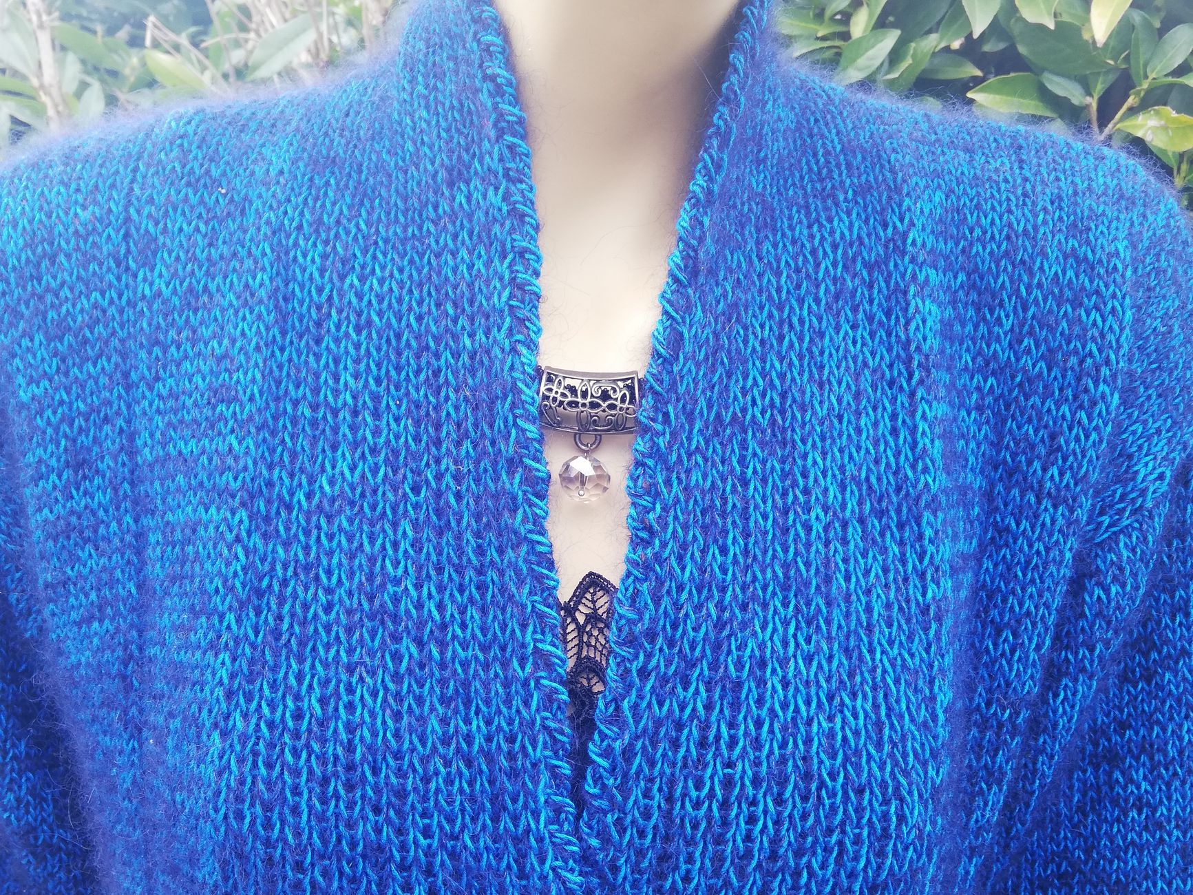 Bei diesem Long-Cardigan stand für mich das Spiel des doppelfädigen Strickens mit 2 unterschiedlichen Uni-Garnen und Materialien im Vordergrund sowie die Figur-Freundlichkeit.