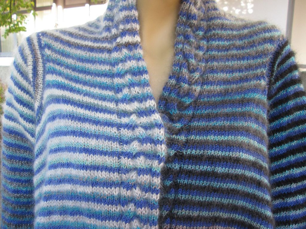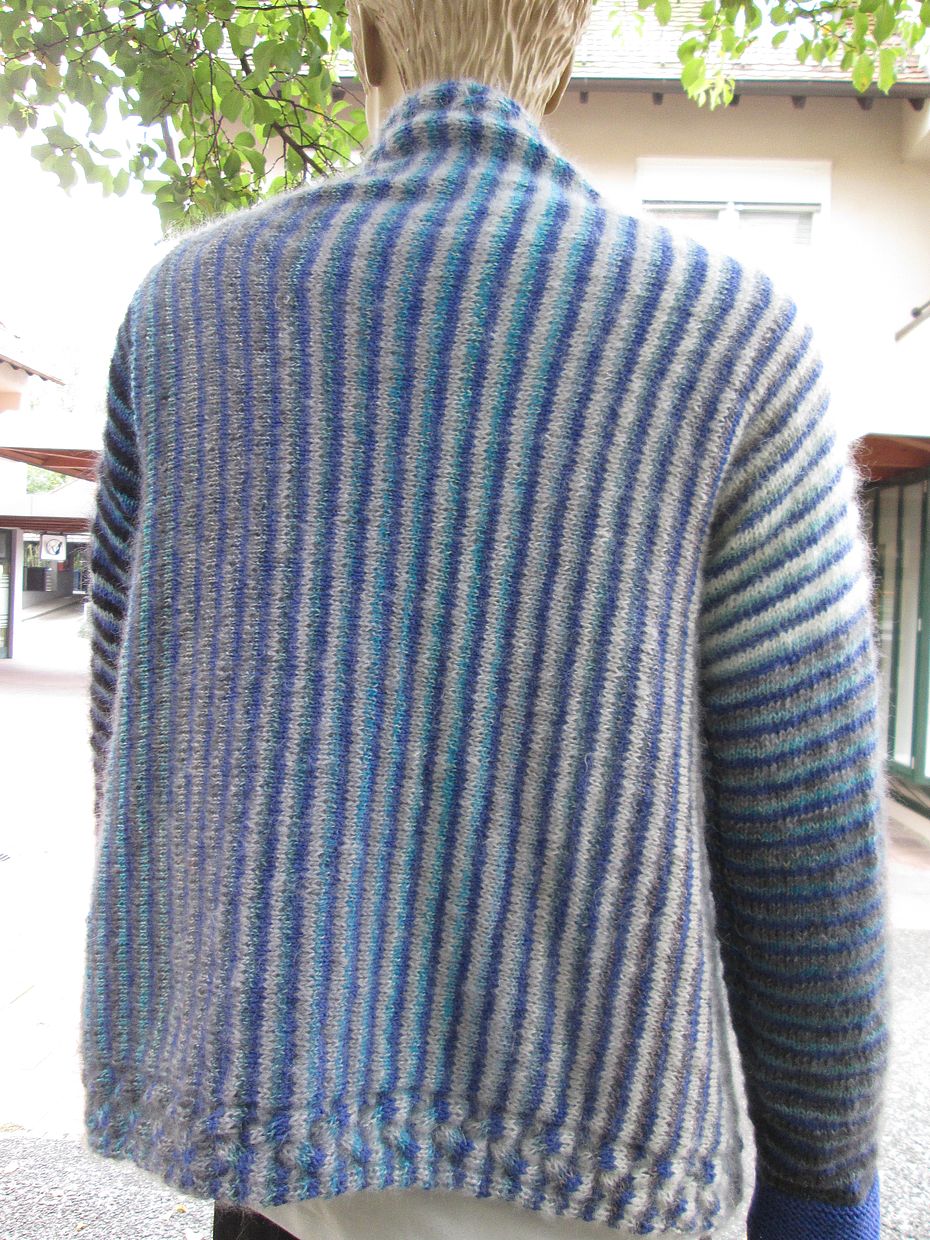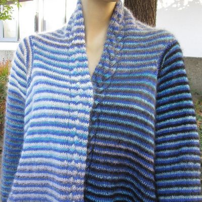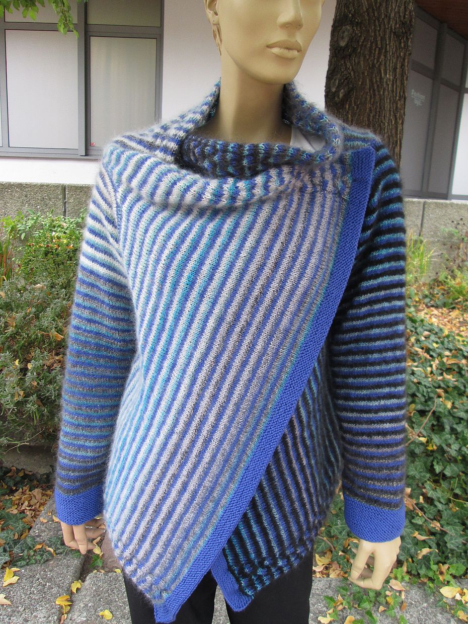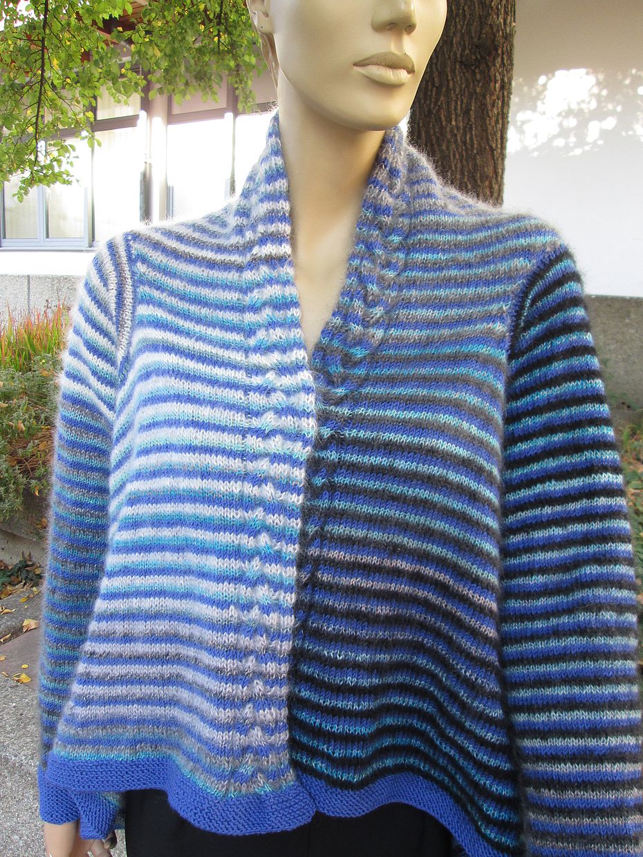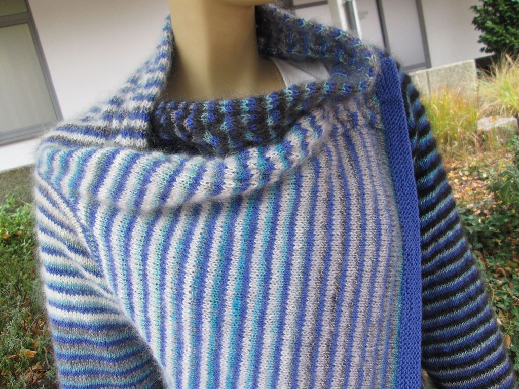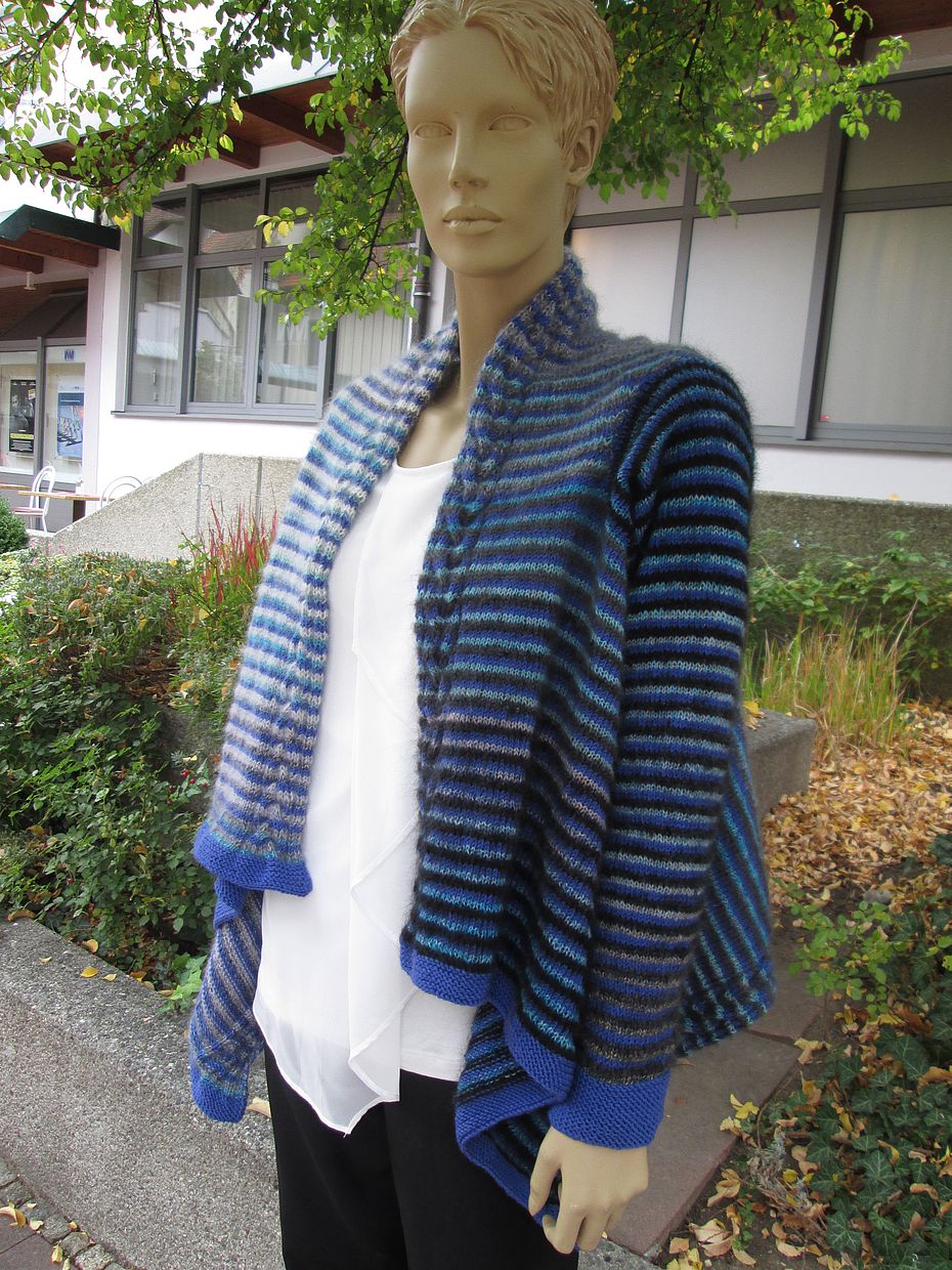 Diese Jacke ist mit mehreren Garnen und Farbstrukturen/-verläufe gestrickt.