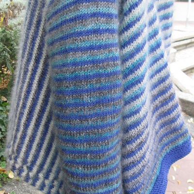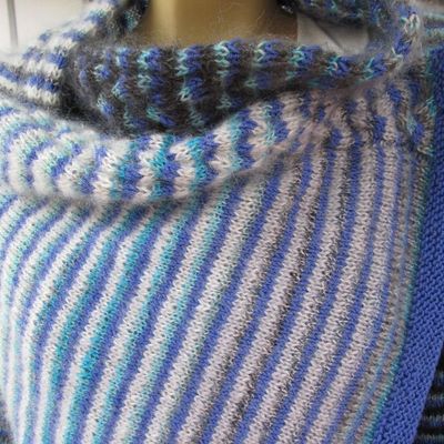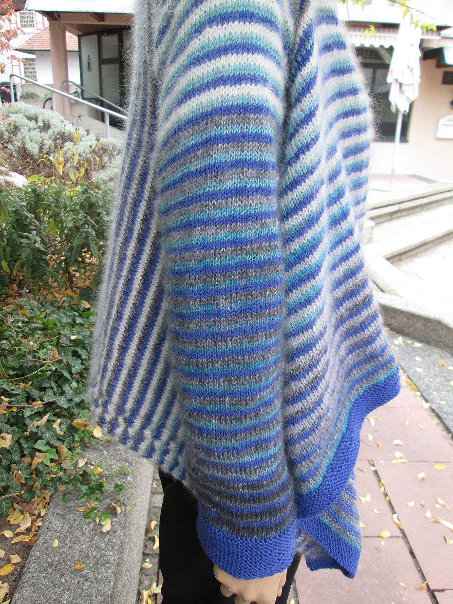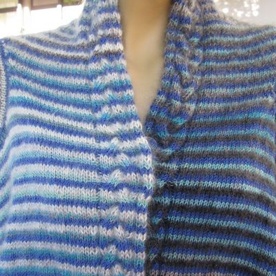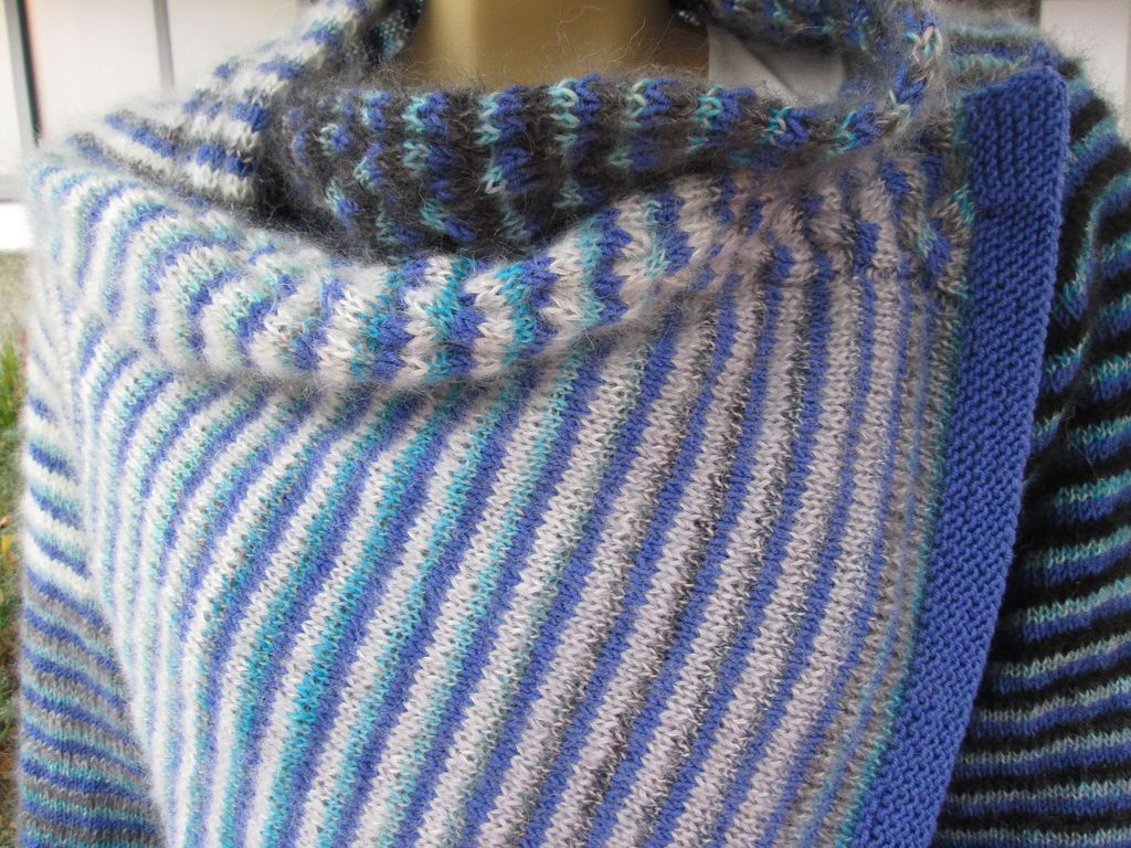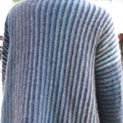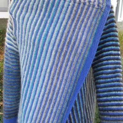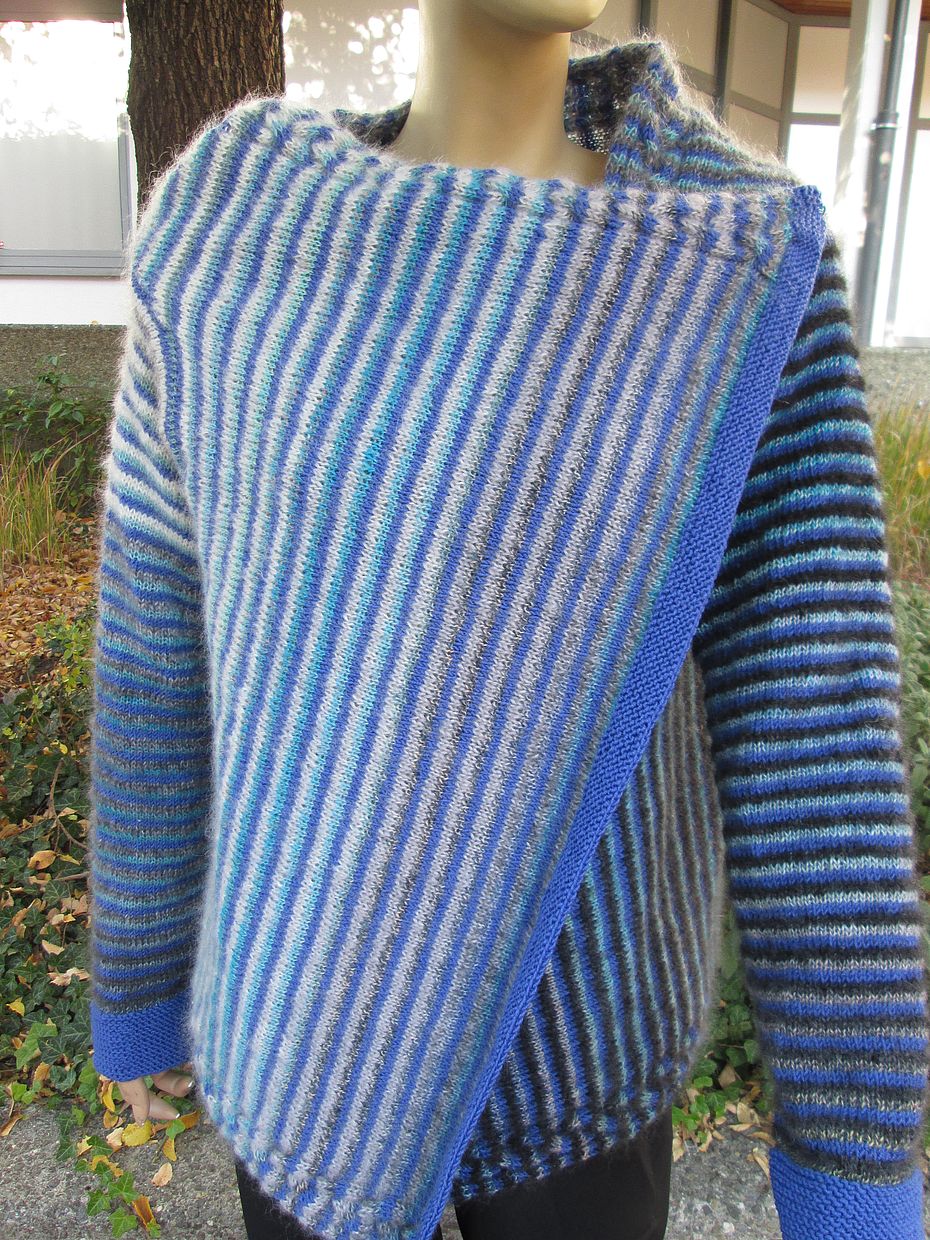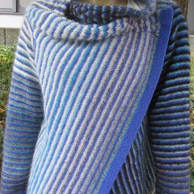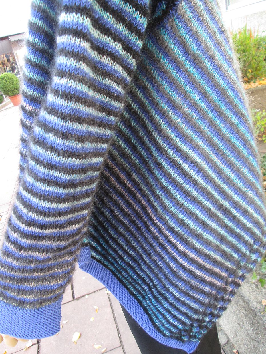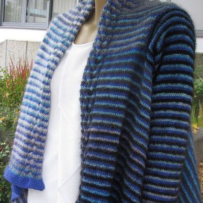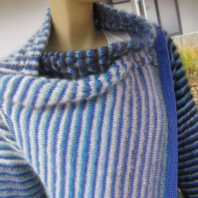 Diese Jacke ist mit mehreren Garnen und Farbstrukturen/-verläufe gestrickt.